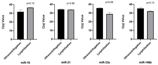 The presence of miR-16 (endogenous control), miR-21, miR-33a, and miR-146b in the total RNA isolated from lyophilized and ultracentrifuged saliva supernatant was confirmed by Real-Time quantitative PCR. No statistical differences were shown between lyophilized and ultracentrifuged samples for assessed microRNA (Figure 4).