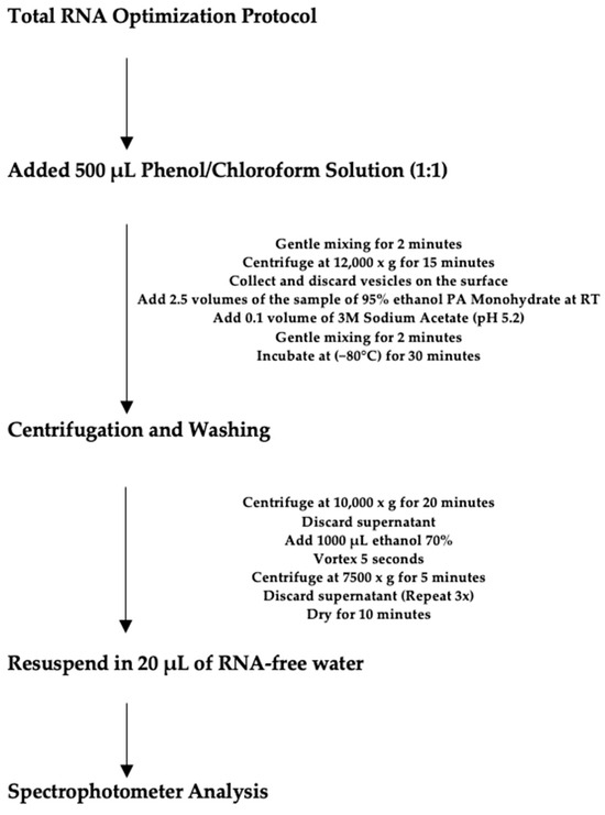 For the five sample preparation protocols performed and the control group (ultracentrifugation), the isolation of exosomal RNA was performed using the Trizol method, according to the manufacturer’s protocol for mRNA extraction outlined in the Trizol™ Reagent User Guide (2023) [58] and relevant literature [15,47]. The total RNA concentration was analyzed using a calibrated NanoDrop® Spectrophotometer 2000 (Thermo Scientific, Wilmington, DE, USA) (samples were collected from participants 1, 2, and 3).