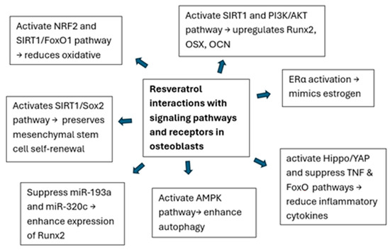 Figure 2. Illustration of the interactions of resveratrol with signaling pathways and receptors in osteoblasts.