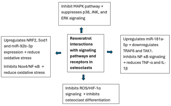 Figure 3. Illustration of the interactions of resveratrol with signaling pathways and receptors in osteoclasts.