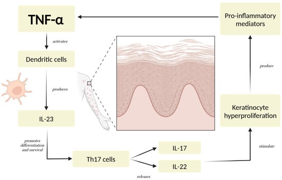 The Psoriatic Inflammatory Loop. TNF-α triggers a series of immune responses involving dendritic cells, Th17 cells, and keratinocytes. These cells, through the production of critical cytokines like IL-23, IL-17, and IL-22, establish a persistent pro-inflammatory state [4,30]. The cycle is reinforced as keratinocytes further stimulate immune cell activation and recruitment, intensifying the inflammatory signaling. This mechanism leads to excessive keratinocyte proliferation, a defining feature of psoriatic lesions, and sustains the chronic nature of the condition [10,32]. Abbreviations: TNF-α: tumor necrosis factor-alpha; IL-23: interleukin-23; IL-17: interleukin-17; IL-22: interleukin 22.