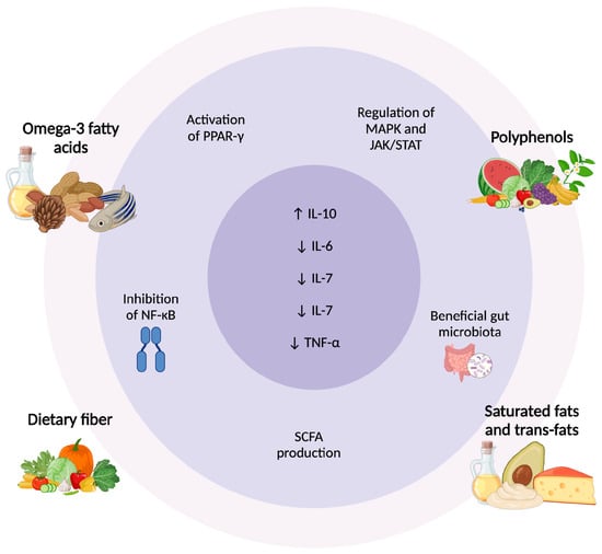 Nutrient-specific interactions play a critical role in shaping cytokine profiles. Omega-3 fatty acids are converted into specialized pro-resolving mediators (SPMs) such as resolvins and protectins, which actively suppress inflammation and downregulate IL-17 and IL-23 levels [114]. Conversely, high consumption of saturated fats and trans fats can stimulate Toll-like receptor signaling, leading to increased production of pro-inflammatory cytokines like IL-1β and TNF-α [115]. Dietary fiber, through its fermentation by gut bacteria, produces SCFAs such as butyrate, which enhance IL-10 production, an anti-inflammatory cytokine, while inhibiting pro-inflammatory cytokines [116]. These nutrient-cytokine interactions highlight the dual potential of diet to either exacerbate or mitigate inflammatory conditions.