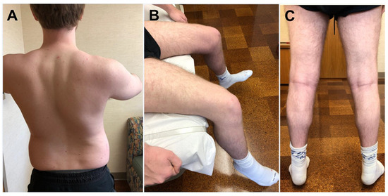 Figure 1. Patient with HSPB8-myopathy. Patient manifested with proximal lower limb muscle weakness that later extended to upper limb and axial muscles. (A) He had difficulty elevating the arms and scoliosis. (B) Quadriceps is atrophic and weak as suggested by his difficulty extending the knees. (C) Calf muscles, although atrophic, had preserved strength, and he was able to stand on toes. (This patient was previously reported: Nicolau et al. [24]).