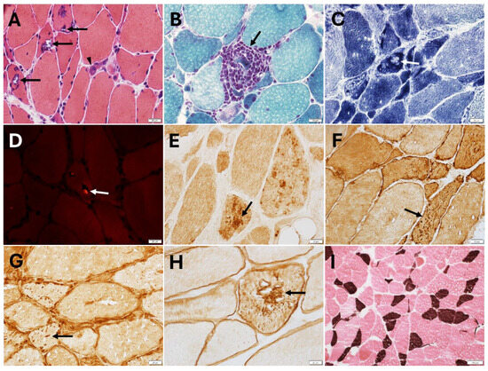 Muscle pathology often shows dystrophic changes with features of myofibrillar pathology and rimmed vacuoles of various degree (Figure 2), depending on the underlying genetic defect [22,23,24,25,26,28,29]. Structural abnormalities can be patchy and the distribution of rimmed vacuoles or myofibrillar pathology may vary even within the same muscle biopsy. Myopathological findings include muscle fiber size variation, fiber atrophy, nuclei internalization, fiber splitting, cytoplasmic bodies, cytoplasmic inclusions, rimmed and non-rimmed vacuoles, sarcoplasmic masses, and increased endomysial fibrous connective tissue. Regenerating and necrotic fibers are either absent or rare. Core-like structures and moth-eaten fibers can be observed on oxidative stains.