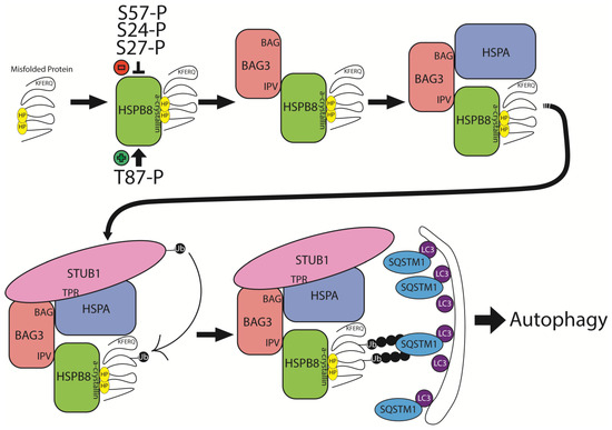Figure 4. Schematic representation of HSPB8’s structural and functional role in chaperone-assisted selective autophagy (CASA). Hydrophobic (HP) residues are exposed on a misfolded protein and recognized by the alpha-crystallin domain of HSPB8, which is modulated by phosphorylation of key residues T87, S27, S24, and S57. HSPB8 recruits BAG3 through interaction with its IV-X-IV (IPV) motif. HSPA (HSP70) binds the BAG domain of BAG3 and recognizes the KFERQ motif on the misfolded substrate, allowing for further stabilization of the misfolded protein. STUB1 is recruited to the complex, interacting with HSPA through its tetratricopeptide repeat (TPR) domain, and polyubiquitinates the misfolded protein. SQSTM1 recognizes the ubiquitinated substrate and serves as an adaptor protein linking the misfolded protein to the autophagic membrane through interaction with LC3. The misfolded protein subsequently undergoes autophagic degradation.