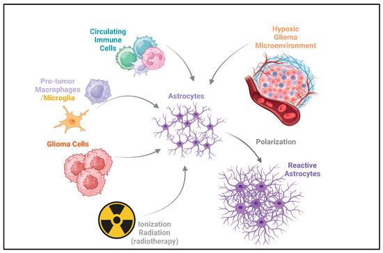 Acquisition of reactivity by astrocytes in glioma. Astrocytes can acquire reactivity through multiple ways, including circulating immune cells, pro-tumor macrophages/microglia, and glioma cells. Ionizing radiation from radiotherapy also acts on astrocytes [17,18,19,20,21,22,23,24,25,26,27,28]. This can potentially induce reactivity in astrocytes, which may contribute to the recurrence of gliomas after radiotherapy [30,32]. Additionally, the hypoxic glioma microenvironment drives the polarization of astrocytes, leading to the formation of reactive astrocytes [24]. The arrows depict the direction of influence and interaction among these components in the glioma microenvironment.
