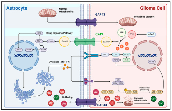 Secondly, direct biphasic interactions of information and material between glioma cells and astrocytes can also be realized through GJs (Figure 2). Since 1999, glioma cells and astrocytes have been shown to produce physical connections via CX43 under co-culture conditions. Also, the morphology of the corresponding astrocytes is significantly altered, as evidenced by an increase in cell volume and the number of membrane protrusions [64]. Sin et al. found that the knockdown of CX43 in astrocytes resulted in a decrease in the migration of cancer cells from the core to the periphery of mouse glioma models, demonstrating that CX43-mediated reactive astrocyte-tumor cell signaling might be important in regulating the invasion and migration of gliomas [19]. Further studies have indicated that the second messenger cyclic guanosine monophosphate-adenosine monophosphate (cGAMP) can translocate from carcinoma cells into astrocytes via CX43-mediated cell–cell junctions, activate the STING pathway to increase their reactivity, and produce inflammatory factors such as interferon-α (IFN-α) and tumor necrosis factor (TNF) [20]. In turn, inflammatory factors can act as paracrine signals to activate STAT and NF-κB signaling pathways in carcinoma cells, thus supporting the malignant progression of gliomas [20,65]. In addition, GAP43 is an actin-associated protein primarily responsible for regulating the formation of neural axon growth cones [66,67]. In astrocytes, GAP43 appears to be associated with the formation and extension of cytomembrane protrusions. Osswald M et al. found that GAP43 expression is upregulated in astrocytes in the context of gliomas, extends cytomembrane protrusions with GFAP as a supportive backbone, connects with glioma cells via GAP43, and constitutes a functional and resistant malignant cellular network. This network allows for the buffering of lethal damage within individual cells, such as the high levels of calcium release accompanying endoplasmic reticulum/mitochondrial damage [68]. It improves the viability of glioma cells. Furthermore, Watson et al. discovered that GAP43 expression is upregulated in GFAP+ astrocytes, potentially enhancing GBM tumorigenicity by facilitating mitochondrial transfer from reactive astrocytes to tumor cells through direct contact [18]. Thus, the GJ-dependent glioma–astrocyte network could increase the tolerance of gliomas during high growth rates, significantly improving their survivability and malignancy. Interestingly, GAP43 can inhibit the activity of protein kinase and AKT signaling pathways in C6 glioma cells, demonstrating a tumor growth inhibitory effect. Typically, GAP43 expression is absent in glioma cells [69]. Thus, GAP43 can help distinguish glioma cells from reactive astrocytes.