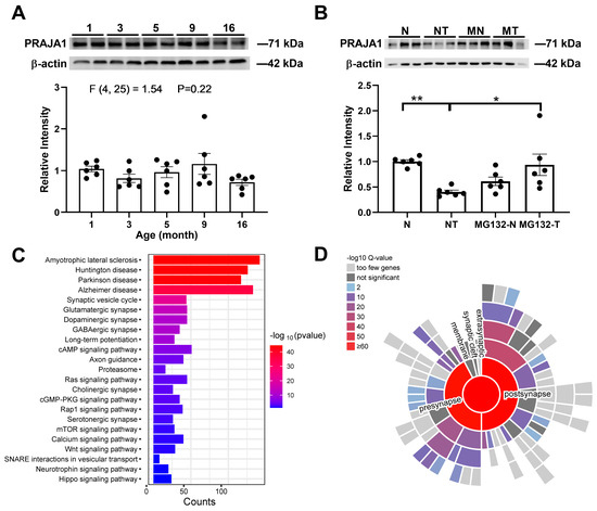 PRAJA1 Expression and Activity-Dependent Degradation in the Hippocampus. (A) Quantification of PRAJA1 protein levels in the CA1 region across different ages of mice, showing stable expression. Representative Western blots are shown above (n = 6 per group; One-way ANOVA, p > 0.05). (B) Activity-dependent decrease in PRAJA1 protein following LTP induction. High-frequency stimulation (STET) significantly reduced PRAJA1 levels, an effect prevented by the proteasome inhibitor MG132. Representative Western blots are shown above. (n = 6 per condition; One-way ANOVA: Sidak’s test: * p = 0.0097, ** p = 0.024; N: no drug, normal conditions; NT: no drug, but STET; MG-132-N (MN): MG-132; MG-132-T (MT): MG-132 and STET). (C) KEGG pathway enrichment analysis of PRAJA1-interacting proteins. The top 23 enriched pathways, ranked by p-value, demonstrate significant associations with neurodegenerative diseases and synaptic plasticity. Bar length indicates pathway richness, and color intensity represents significance (−log10 (p-value)). (D) Sunburst plot illustrating cellular component enrichment analysis of PRAJA1-interacting proteins. The size of each segment reflects the number of associated proteins, with color intensity indicating enrichment significance. A large proportion of interacting proteins are localized to synaptic components.