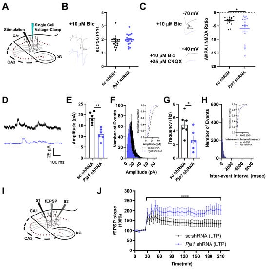 To dissect the role of PRAJA1 in synaptic function within the CA1 region, we first examined glutamatergic transmission in CA1 pyramidal neurons using whole-cell recordings. Crucially, while presynaptic release probability, assessed by the paired-pulse ratio (PPR) of AMPAR-mediated evoked EPSCs (eEPSCs), remained unchanged in Pja1 knockdown neurons (Figure 3A,B; Pja1 shRNA: 1.98 ± 0.09, n = 20 cells; sc shRNA: 1.86 ± 0.12, n = 16 cells; p > 0.05), postsynaptic function was significantly altered. Specifically, the ratio of NMDAR-mediated to AMPAR-mediated eEPSCs (NMDA/AMPA ratio) was markedly reduced in Pja1 deficient neurons (Figure 3C; Pja1 shRNA: 0.227 ± 0.047, n = 19 cells; sc shRNA: 0.382 ± 0.051, n = 15 cells; p < 0.05). Consistent with this functional impairment, quantitative RT-qPCR analysis revealed significant downregulation of mRNA transcripts for key AMPAR (Gria1, Gria2) and NMDAR (Grin2a, Grin2b) subunits in the Pja1 knockdown group (Figure S1A).