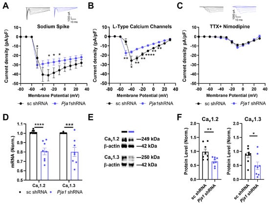 To further investigate the functional consequences of Pja1 deficiency, we examined neuronal excitability using whole-cell voltage-clamp recordings. Pja1 knockdown significantly reduced both voltage-gated sodium currents (VGSCs) and L-type voltage-gated calcium currents (VGCCs) in CA1 neurons (Figure 4A–C). Specifically, INa was significantly lower between −30 and −10 mV, and ICa was significantly reduced between −50 mV and +10 mV (Figure 4B,C; * p < 0.05). In contrast, T-type calcium currents were unaffected by Pja1 knockdown (Figure 4C). Consistent with the reduction in L-type currents, RT-qPCR and Western blot analysis revealed significant decreases in the mRNA and protein levels of Cav1.2 and Cav1.3, the α1 subunits of L-type VGCCs, in Pja1-deficient CA1 (Figure 4D–F; Cav1.2 mRNA: **** p < 0.0001; Cav1.3 mRNA: *** p < 0.0005; Cav1.2 protein: ** p < 0.01; Cav1.3 protein: * p < 0.05).