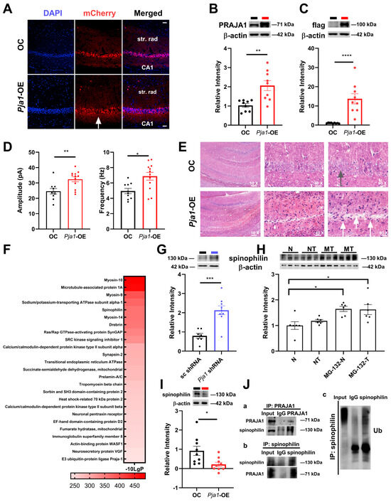 PRAJA1 overexpression in the hippocampal CA1 region induces neuronal and synaptic alterations. (A) Pja1 Overexpression: Representative immunofluorescence images of the CA1 region showing mCherry (red, indicating Pja1 expression) and DAPI (blue, nuclear stain) in mice injected with control virus (OC, top row) or Pja1-OE virus (bottom row). Scale bar: 50 μm. (B,C) Confirmation of overexpression: Western blot analysis of Pja1 and FLAG tag (confirming the expression of the Pja1-OE construct) levels in the hippocampal CA1 region. OC: n = 9; Pja1-OE: n = 9; ** p < 0.01, **** p < 0.0001. (D) mIPSC frequency and amplitude: Quantification of mIPSC frequency and amplitude in CA1 pyramidal neurons (Pja1-OE results are displayed or labeled in red color for symbols, bars and lines and in black color for OC or sc shRNA groups). Amplitude, Pja1-OE: 32.39 ± 1.64, n = 12 cells, OC: 24.58 ± 1.79, n = 10 cells, * p < 0.05; frequency: ** p < 0.01; N = 3 mice per group, unpaired t-test). (E) Calcium Staining: Von Kossa staining of the CA1 region revealed increased intracellular calcium deposition in cells (white arrows on dark blue cells) and cell death (one arrow on white region) in Pja1-OE mice. The stratum pyramidale layer remains intact in OC mice (green arrow). (F) Ranking of 25 identified proteins specifically associated with PRAJA1 in the hippocampus on the basis of the −10-log p-value according to the mass spectrometry data. These identified proteins were screened on the basis of intensity and enrichment ratio. (G–I) Spinophilin protein levels: Western blot analysis showing spinophilin protein levels in the CA1 region under control conditions (OC & sc shRNA), (G) Pja1 shRNA vs. sc shRNA, Pja1 shRNA 2.13 ± 0.23, n = 9; sc shRNA 0.80 ± 0.16, n = 7; *** p < 0.001 (WB lanes: sc shRNA: black line; Pja1 shRNA: blue line). (H) Pja1-OE + MG-132, and OC + MG-132 conditions (* p < 0.05, Sidak’s multiple comparisons test, n = 6 per group, N: no drug, normal conditions; NT: no drug, but STET; MG-132-N (MN): MG-132; MG-132-T (MT): MG-132 and STET). (I) Pja1-OE vs. OC (n = 9 per group). * p < 0.05. (J) Co-immunoprecipitation analyses: (a) Co-immunoprecipitation experiments confirming the interaction between PRAJA1 and spinophilin, and demonstrating ubiquitination of spinophilin. Bands of spinophilin at the position corresponding to 130 kDa were detected in the immunoprecipitates obtained with the antibody against PRAJA1 in CA1 extracts. (b) Bands of PRAJA1 at the position corresponding to 130 kDa were detected in the immunoprecipitates obtained with the antibody against spinophilin in CA1 extracts in Co-IP experiments. (c) Bands of ubiquitin (K48) at the position corresponding to 130 kDa were detected in the immunoprecipitates obtained with the antibody against spinophilin in CA1 extracts in Co-IP experiments.
