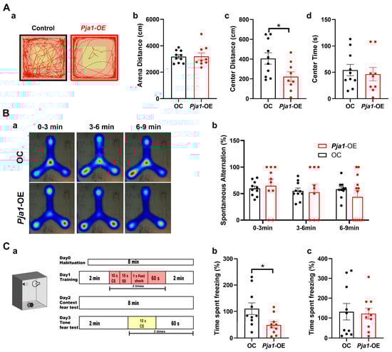 In contrast to the effects of Pja1 knockdown, overexpression of PRAJA1 in the CA1 region resulted in distinct behavioral alterations. Open field testing revealed that Pja1-OE mice exhibited a significantly shorter ambulatory distance in the center zone compared to controls (Figure 7(Ac); Pja1-OE: 222.7 ± 48.4 cm, n = 9; OC: 406 ± 58.5 cm, n = 10; * p < 0.05, Mann-Whitney test), suggesting increased anxiety-like behavior. Furthermore, Pja1-OE mice showed increased variability in Y-maze exploration, with a tendency to remain in the corners more often than control mice (Figure 7B; p >0.05). Notably, a substantial proportion of Pja1-OE mice failed to meet the exploration criteria in both the object recognition and object location memory tasks (Tables S1 and S2). Additionally, Pja1-OE mice displayed impaired trace fear memory, as demonstrated by significantly reduced freezing behavior during the context test (Figure 7(Cb); Pja1-OE: 48.97 ± 11.42%, n = 10; OC: 110.4 ± 22%, n = 10, * p < 0.05), indicating impaired hippocampus-dependent associative learning.