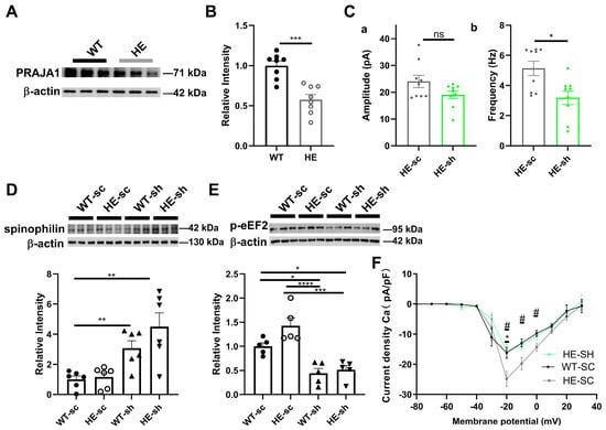 Given the role of PRAJA1 in synaptic function and plasticity, and reports of altered PRAJA1 expression in Alzheimer’s disease (AD) patients [20], we examined its involvement in AD-related synaptic dysfunction using the 5xFAD mouse model. Consistent with previous findings, we observed a significant decrease in PRAJA1 protein levels in the hippocampus of 5xFAD mice compared to wild-type controls (Figure 8A,B; WT: 1 ± 0.55; HE: 0.58 ± 0.06; n = 8 per group, *** p = 0.0002). Further knockdown of PRAJA1 in 5xFAD mice resulted in a significant decrease in the frequency of mIPSCs in CA1 neurons (Figure 8Cb; HE-sc shRNA: 5.14 ± 0.48 Hz; HE-Pja1 shRNA: 3.19 ± 0.45 Hz; n = 9 cells per group, * p < 0.05), suggesting that reduced PRAJA1 may contribute to the elevated mIPSC frequency typically observed in this AD model. Pja1 knockdown in 5xFAD mice also led to a significant decrease in the levels of phosphorylated eukaryotic elongation factor 2 (p-eEF2) (Figure 8E). Interestingly, despite no significant difference in basal spinophilin levels between wild-type and 5xFAD mice, Pja1 knockdown in the 5xFAD background significantly increased spinophilin protein levels (Figure 8D). Finally, while AD mice show an age-related increase in VGCC density, further knockdown of Pja1 in 5xFAD mice suppressed VGCC currents (Figure 8F; * p < 0.05 for WT vs. HE, # p < 0.05 for HE sc shRNA vs. HE Pja1 shRNA).