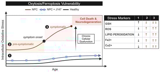 While these recent therapeutic developments mark a promising step forward in NPC symptom management [,], they remain palliative, addressing consequences rather than root causes of the disease, and understanding the fundamental molecular and cellular mechanisms driving NPC neurodegeneration remains a key objective for the development of evidence-based therapies. Here, we propose the hypothesis that NPC pathology may be driven, at least in part, by the early activation of the regulated cell death pathway known as oxytosis/ferroptosis. Our hypothesis is based on the shared characteristics of NPC and oxytosis/ferroptosis, including increased lipid peroxidation, elevated levels of iron, mitochondrial dysfunction, and Ca2+ dyshomeostasis [,,,]. Furthermore, we hypothesize that the activation of cell death by oxytosis/ferroptosis in NPC is not a binary event, but rather the culmination of iron-driven oxidative stress that contributes to the differential cell vulnerability as described in our sublethal threshold model (Figure 1). At early stages prior to reaching that threshold, this heightened vulnerability is potentially reversible, as our own data (Figure 4) and multiple studies in other neurodegenerative conditions [,] using the anti-oxytotic/ferroptotic compound J147 suggest. However, as oxidative stress continues to increase with age and the antioxidant systems become unable to counteract it, there is a transition to cell death (Figure 1).
