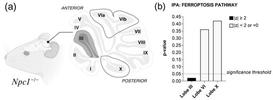 IPA Core Analysis of pre-symptomatic Npc1−/− cerebellar lobules. (a) Anatomical illustration of the Npc1−/− mouse cerebellum, depicting regions of interest potentially affected by oxytosis/ferroptosis. (b) Results of the IPA Ferroptosis Pathway show significant upregulation in lobule III of the pre-symptomatic Npc1−/− cerebellum (z-score= 2.00; p-value 2.23 × 10−2) when compared to the control cerebellum lobule III. Npc1−/− cerebellar lobules VI (z-score= 0; p-value 3.61 × 10−1) and X (z-score= 0; p-value 4.21 × 10−1) are not significant compared to their control counterparts. Significance is determined by a z-score of ≥ 2.00 and p-value < 0.05.