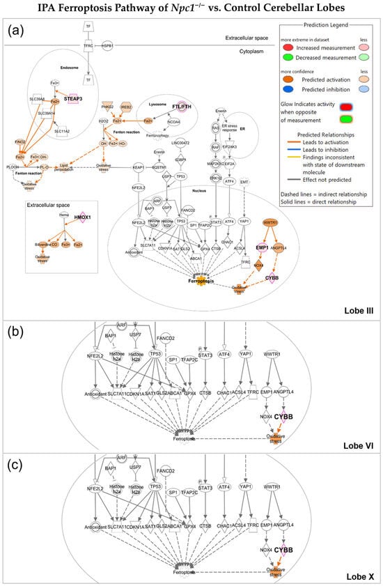 Given the distinct spatiotemporal neurodegeneration in the cerebellum in NPC, which begins in the anterior lobules I–III and progresses to more posterior lobules, it is plausible that this pattern reflects varying levels of sublethal oxytotic/ferroptotic stress, as hypothesized in Figure 1. Higher oxytotic/ferroptotic stress in the anterior lobules, such as increased iron, lipid peroxidation, and ROS, may lead to earlier activation of cell death. Our secondary in silico analysis of pre-symptomatic Npc1−/− cerebellar data generated by Martin et al. (2020) [] supports this model. Specifically, IPA analysis of Npc1−/− Purkinje neurons of anterior lobule III reveals significant activation of oxytosis/ferroptosis, whereas lobules VI and X are not affected (Figure 3). Among the genes upregulated in Npc1−/− lobule III, Steap3, Hmox1, and Flt are key regulators of iron homeostasis, while Emp1 and Cybb are involved in ROS generation. The dysregulation of iron homeostasis coupled with increased ROS production could thereby promote conditions favorable to an increase in lipid peroxidation []. In contrast to Npc1−/− anterior lobule III, cerebellar lobules VI (Figure 3b) and X (Figure 3c) both share a single upregulated gene in the oxytosis/ferroptosis pathway, Cybb, that alone is not predicted to increase oxytotic/ferroptotic cell death. Aligning with our hypothesis, we conclude that upregulation of genes involved in Fe2+ regualtion and ROS production supports the idea that the pre-symptomatic anterior lobule III is in an early state of sublethal oxytotic/ferroptotic stress while posterior lobules VI and X have yet to be affected in pre-symptomatic Npc1−/− mice.