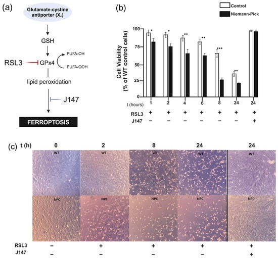 In the context of our model, we reasoned that additional exposure to oxytotic/ferroptotic stress would reveal a higher number of NPC cells dying by oxytosis/ferroptosis than age-matched control cells, because of the higher baseline of oxytotic/ferroptotic stress in NPC (Figure 1). To begin to test this hypothesis, we treated dermal fibroblasts from NPC patients and controls with Ras-selective Lethal 3 (RSL3), a ferroptosis inducer that inhibits GPx4 activity, thereby impairing antioxidant defenses against lipid peroxidation [,] (Figure 4a). If NPC cells are indeed closer to an irreversible threshold of oxytotic/ferroptotic death (Figure 1), the additional oxytotic/ferroptotic stress generated by RSL3 treatment would be expected to push a greater number of NPC cells beyond that threshold. To align with our previous studies investigating the role of RSL3 in oxytosis/ferroptosis in cultured cells [,], we treated cells with 100 nM RSL3 at various timepoints up to 24 h and quantified cell death using the MTT assay. Figure 4b shows the effect of RSL3 on cell survival in NPC cells (6 months old; #GM17923) and healthy controls (1 year old; #GM05659). Differences in vulnerability to RSL3 are measurable at all timepoints. Figure 4c provides a visualization of the morphological changes in cells exposed to RSL3 at the corresponding time. Notably, co-treatment with the anti-oxytotic/ferroptotic compound J147 completely reversed cell death induced by RSL3 (Figure 4b,c), confirming that oxytosis/ferroptosis is the primary mechanism of cell death in this experimental context. Supplemental Figure S1 provides a comparable analysis of NPC and control cells from different age-matched individuals, further highlighting the differential response to RSL3, with NPC cells displaying increased vulnerability.