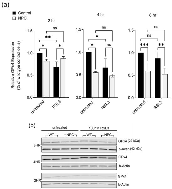 NPC cells express lower Glutathione Peroxidase 4 (GPx4) levels. (a) Relative levels of GPx4 expression across 2, 4, and 8 h following 100 nM RSL3 treatment. Experiments were run in duplicates (n = 3 per timepoint). Data were normalized to β-actin and two-way ANOVA was performed (* p < 0.05; ** p < 0.01; *** p < 0.001). ns: non-significant (b) Representative images of Western blots for 6-month-old NPC (#GM17923) and 1-year-old wildtype control (#GM05659).
