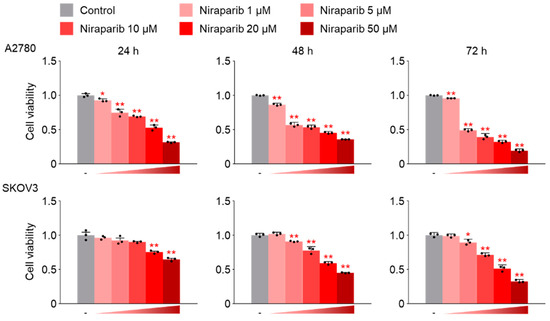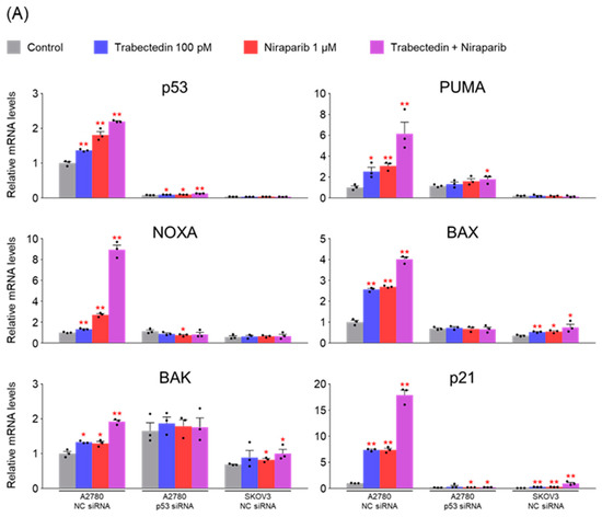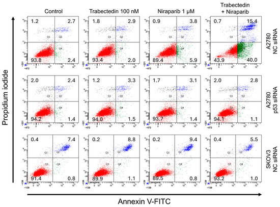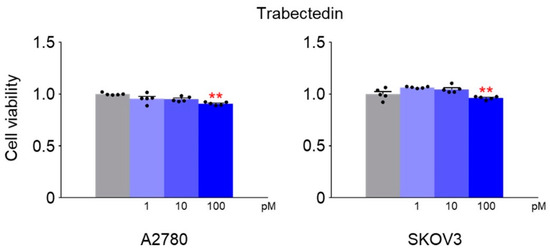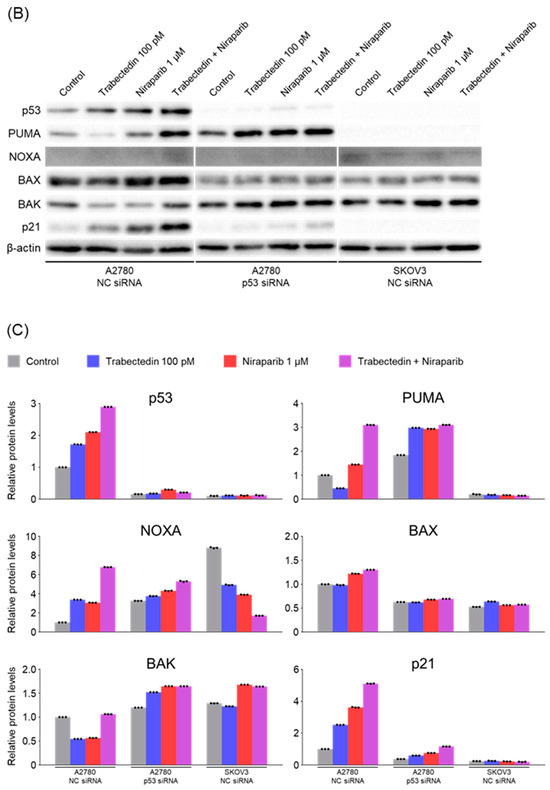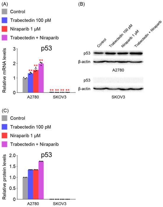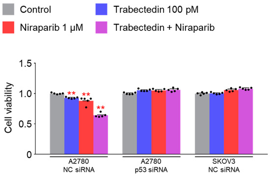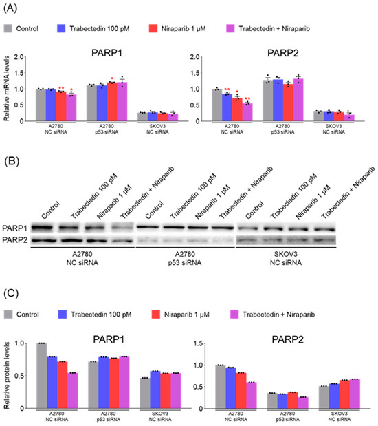 The SKOV3 cell line, with its p53 gene knockout, cannot be considered representative of epithelial ovarian cancer, given that the majority of TP53 mutations in this type of cancer are missense mutations. Therefore, additional research using a broader range of epithelial ovarian cancer cell lines is necessary, and the efficacy needs to be verified through animal experiments using xenografts. Furthermore, there is a need for research on the effectiveness of trabectedin in combination with other PARP inhibitors, apart from niraparib.