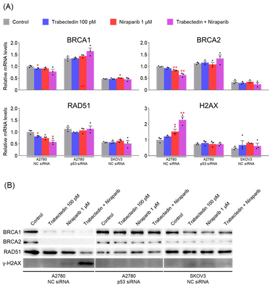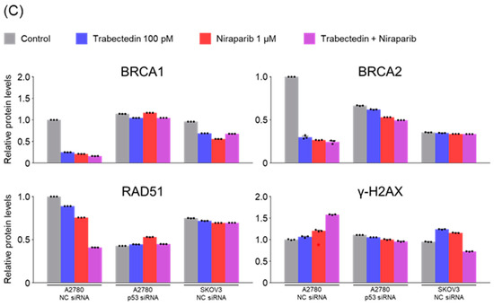 However, the results of this study did not support this prediction. In the findings of this study, not only were PARP1 and PARP2, involved in ssDNA break repair, more inhibited in the combination therapy of trabectedin and niraparib than in either agent alone, but factors associated with dsDNA break homologous recombination repair (BRCA1, BRCA2, and RAD51) were also suppressed. This was accompanied by an increase in γ-H2AX, indicating DNA damage, along with a decrease in cell viability, ultimately leading to apoptosis. These results were observed in A2780 cells (with wild-type p53), but not in SKOV3 cells (p53 knockout). Additionally, the synergistic effect observed in A2780 was found to be attenuated upon the loss of p53 through p53 siRNA. This study demonstrated that the combined therapy of trabectedin and PARP inhibitors can induce BRCAness and elicit a synthetic lethality effect in BRCA-proficient epithelial ovarian cancer cells. It also highlighted the significance of the p53-mediated apoptotic pathway in such a synergistic effect. This result suggests that there may be an as-yet-unknown mechanism by which trabectedin, in combination with niraparib, induces homologous recombination deficiency.