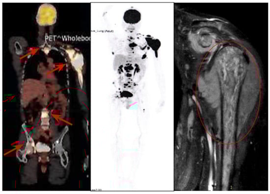 According to 18F-FDG PET-CT data, the disease exhibited significant localized spread, with a soft tissue mass surrounding the left shoulder measuring 104 × 110 mm (SUVmax 26.38) (Figure 1).