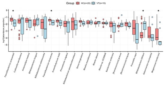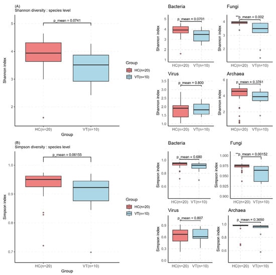 Beta diversity was analyzed using the Bray–Curtis method to calculate distances based on species abundance differences between samples. While the individual values of the HC group were closely clustered together showing similar distribution, the VT group showed distinct distribution compared with the HC group with larger variation between samples (p value, 0.005). This pattern suggests that the gut microbiota of the VT group was imbalanced, in contrast to the consistent homogeneity observed in the HC group. This pattern appeared similar throughout the microbial domains (Figure 2). On the other hand, virus showed a large variation among each sample in both groups, which could be because the gut virome is highly individualized with significant interpersonal variation but low intrapersonal diversity over time [,].