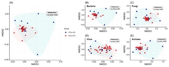 The β-diversity analysis of gut microbiome in vitiligo (VT, blue) and health control (HC, red) groups using NMDS plot across multiple microbial domains: (A) Overall microbial community, (B) Bacteria, (C) Fungi, (D) Virus, and (E) Archea. * p value < 0.05, ** p value < 0.01.