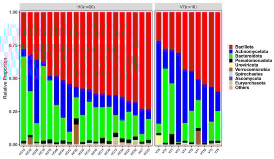 The gut microbial composition of all domains at the phylum level between the vitiligo (VT) and healthy control (HC) groups.