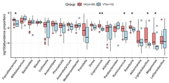 The gut microbial abundance of the vitiligo (VT) and healthy control (HC) groups at the genus level. * p value < 0.05, ** p value < 0.01.