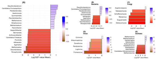 The most significantly enriched genus between the vitiligo (VT, blue) and healthy control (HC, red) groups across multiple microbial domains: (A) Overall microbial community, (B) Bacteria, (C) Fungi, (D) Virus, and (E) Archaea. The color scale represents the log-transformed mean p value, indicating the statistical significance of each pathway and the lower p values are indicated in darker color gradient.