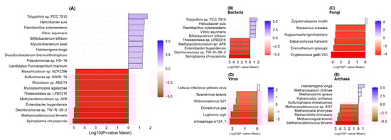 The most significantly enriched species between the vitiligo (VT, blue) and healthy control (HC, red) groups across multiple microbial domains: (A) Overall microbial community, (B) Bacteria, (C) Fungi, (D) Virus, and (E) Archaea. The color scale represents the log-transformed mean p value, indicating the statistical significance of each pathway and the lower p values are indicated in darker color gradient.