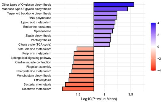 The HMP Unified Metabolic Analysis Network (HUMANN3.0) was used to analyze the metabolic functions of the microbial communities. HUMANN3.0 maps shotgun sequencing reads to known gene families and links these to metabolic pathways. Using information from the taxonomic classification, reads were assigned based on amino acid sequences to specific pathways by referencing protein information and annotations in the UniRef database [,]. This allowed us to calculate the relative abundance of genes and pathways within the microbial communities. Additionally, HUMANN results were further processed to convert metabolic data into Kyoto Encyclopedia of Genes and Genomes (KEGG) pathways for downstream analysis, enabling a more comprehensive exploration of metabolic functions within the microbial communities.