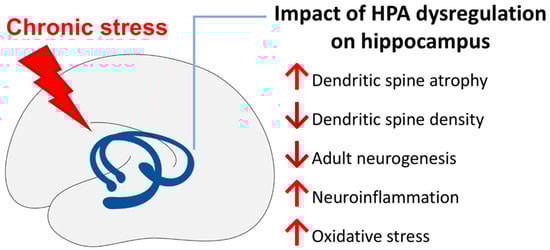 Numerous studies have highlighted the impact of stress on the hippocampus, which is vulnerable and crucial for regulating autonomic function and the HPA stress response in complex behaviour and cognition. These alterations include dendritic atrophy, synaptic spine loss, suppressed neurogenesis, and volumetric reductions, which collectively impair hippocampal-dependent cognitive processes such as memory formation and emotional regulation [,,,,]. The alteration of brain regions is now recognised as a consequence of dendritic remodelling following chronic stress exposure []. The activation of glucocorticoid receptors, excitatory amino acid signalling, and corticotropin-releasing hormone (CRH)-mediated pathways collectively disrupt cytoskeletal integrity and synaptic plasticity. Simultaneously, stress-induced epigenetic alterations and the dysregulation of neurotrophic substances such as BDNF exacerbate hippocampus susceptibility. A substantial hippocampal volume reduction in depressed individuals was observed in an extensive imaging study involving 1000 patients with unipolar depression and numerous healthy control participants []. Stress and glucocorticoids were identified to be the principal factors contributing to the shrinkage of dendrites and loss of spines in the hippocampus [].