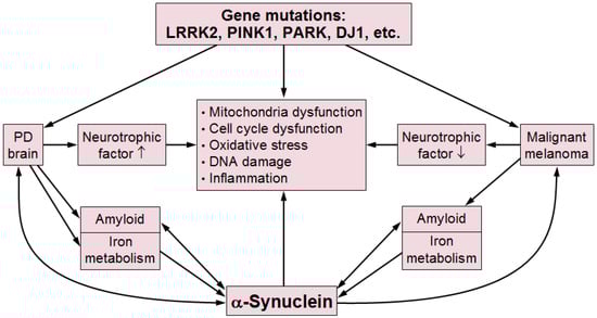 Although clinical and epidemiological associations between PD and cancer, in particular melanoma, are well established, the causal relationships between the two disorders are not fully explored. In particular, the genetic, cellular and molecular pathways linking these diseases are poorly understood. Accumulating data point to the roles of genetic traits, synucleins, neurotrophic factors, DNA damage and other shared molecular factors that are involved in the association between PD and cancer (for a review, see [301]).
