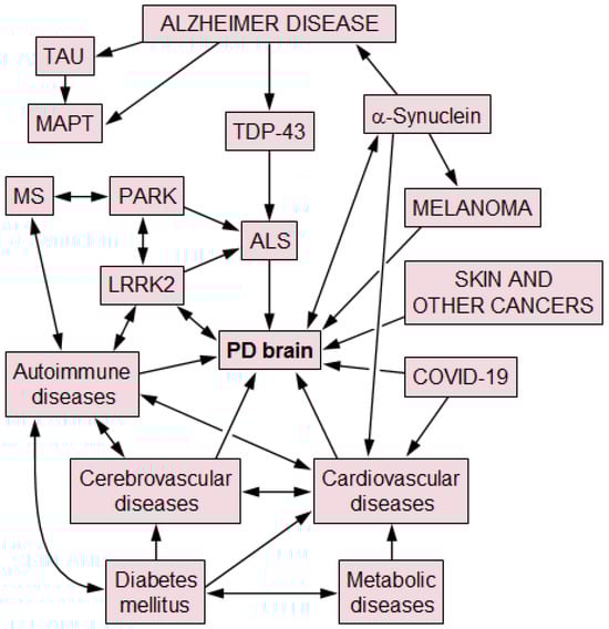 Amyotrophic lateral sclerosis: The coexistence of ALS with PD, although rather uncommon, is found to a greater degree than one would expect by chance. Parkinsonian features have been reported in up to 30% of ALS patients and LBs have been reported in a certain number of ALS cases [181]. This unique co-occurrence has been referred to as Brait–Fahn–Schwartz disease [182]. The causes and pathomechanisms of the selected neurodegeneration in both disorders are not fully understood, but their coexistence suggests that they could share common biomechanisms [183]. An older multicenter study demonstrated that there is a strong association between PD, ALS and the gene encoding angiogenin (ANG) variants, which may be a genetic link between both disorders [184]. Biochemical, molecular genetics and animal model studies have suggested that malfunctioning mitochondria might contribute to neuronal death in both PD and ALS [185], which was confirmed by later studies [186]. Others have discussed serotonergic dysfunction related to the common lesioning of the raphe nucleus [187] or peripheral immune activation as shared pathogenic pathways [188,189]. Genetic studies have supported the role of MMP-9 (matrix metalloproteinase-9) polymorphism in the risk of PD and ALS [190], whereas modern GWASs have identified eleven genetic risk loci shared among PD, ALS and AD. This supports lysosomal dysfunction, OS and DNA damage response as being transdiagnostic processes underlying the pathogenesis of these disorders [191]. A meta-analysis of de novo MR studies indicated that genetic predicted levels of various physical activities were related to a raised risk of ALS, but not causally with PD [192]. The description of PD-ALS clinical complex supports the hypothesis of there being common neuropathological pathways related to the frequent co-occurrence of αSyn and tau aggregation in such brains, suggesting the synergistic interaction of these (and other) proteins in determining the neurodegenerative process. A recent case report in a 54-year-old Italian woman with iPD later complicated by ALS carrying a novel MAPT variant (Pro494Leu) supported the hypothesis of a genetic dysfunction as the basis of multiple neurodegenerative disorders [193]. The Parkinson-dementia and ALS association complex of Guam [194,195] is not a matter covered in this review.