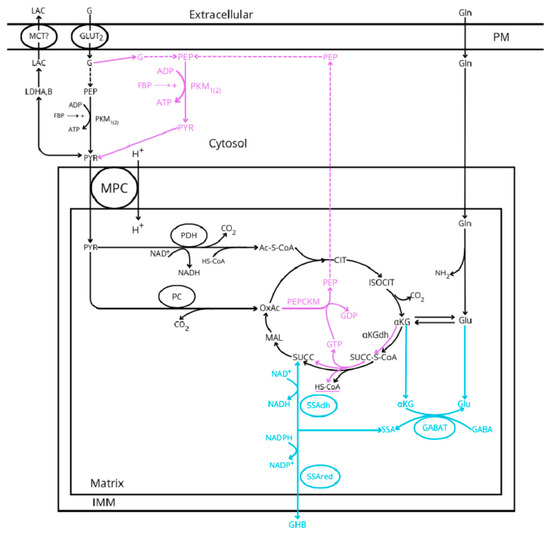 - Our previous proposal of the required use of the GABA-shunt for the oxidative metabolism of glycolytic-derived pyruvate [6] is compatible with the canonical model of the stimulus–secretion coupling of glucose-induced insulin release. However, the GABA-shunt pathway skips the synthesis of PEP by the GTP-dependent succinyl-CoA synthetase. As the “ADP privation” model [22] requires the mitochondrial supply of PEP to sustain the stimulation of insulin secretion by glucose, it would be interesting to know how much the limitation exerted by the low expression of α-ketoglutarate dehydrogenase (αKGdh in Figure 1) allows a significant citric acid cycle flux in the two pathways. It has been demonstrated in INS-1 832/13 cell line and rat islets [46,47] that the intracellular concentration of α-ketoglutarate (αKG or 2-OG) is increased more than 20-fold (more intensively than any other mitochondrial metabolite investigated) at 16.7 mM, as compared with 2.8 mM glucose, strongly supporting a strict control of the cyclic acid cycle flux by the αKGdh in β-cells.
