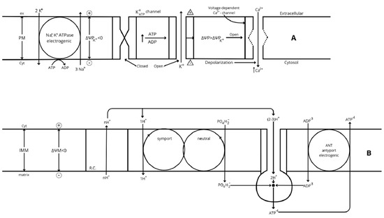 Figure 2. (A) Regulation of plasma membrane electric potential (ΔΨP = ΨPCyt − ΨPex). The K+ diffusion gradient through the plasma membrane is at equilibrium with the membrane electrical potential in resting cells: the Na+, K+-ATPase catalyzes a non-compensated antiport of 2K+ in and 3 Na+ out of the cell, generating an inverse gradient of both ions. The higher plasma membrane permeability to K+ than Na+ allows a higher outwards diffusion of K+ than the inwards return of Na+, developing an increasing electric potential (ΔΨP) through the plasma membrane. In resting cells, ΔΨM hyperpolarizes until the influx of K+ promoted by the electrical potential counteracts its efflux rate by the generated concentration gradient, and the net K+ flux through the plasma membrane becomes null; the value of this electrical potential is called K+ equilibrium potential (ΔΨPK+ < 0). β-cell activation by ATP/ADP closure of K+ATP channels diminishes the efflux of K+ without affecting the entrance of Na+ and induces a depolarization of the resting (or ΔΨPK+) potential, which becomes less negative. The Na+, K+-ATPase restores the altered ionic gradients after the stimulus. (B) Overview of the mechanism of oxidative phosphorylation. The specific potential redox created by each respiratory complex (RCs) is first transduced to an electrochemical potential by a proportional efflux of H+ from the matrix to the intermembrane space. The electrochemical potential generated (Δp = −ΔΨM + 60 (pHm − pHi), also known as proton motive force (PMF), has two components according to its name: a concentration potential generated by the difference of pH between the matrix (m) and the intermembrane space (i) (ΔpH = pHm − pHi > 0), and an electrical potential (ΔΨM = ΨMm − ΨMi < 0). The electrical component is the more directly implicated component, via hyperpolarization, in an increase of mitochondrial metabolism and the corresponding increase of oxygen consumption (OCR): its hyperpolarization is implicated in the final transduction of electrical potential into chemical energy for the synthesis of the terminal phosphodiester bond of inorganic phosphate (PO4H2−) to ADP to produce ATP (oxidative phosphorylation, OxPhos). The electrogenic antiporter (ANP) of matrix ATP−4 outward against cytosolic ADP−3 inward, favored by ΔΨM hyperpolarization, maintains a cytosolic ATP/ADP ratio greater than the mitochondrial one (around seven-fold in the liver) [58]. This means that the energetic value of ATP hydrolysis in the cytosol is greater than it would be in the mitochondria. On the other hand, the mitochondrial synthesis of ATP requires less energy than the reverse reaction. Symport of PO4H−2 with 1H+ is also energized by hyperpolarized ΔΨM. Finally, the NADH/NAD+ ratio is greater in the mitochondrial matrix than in the cytosol, suggesting that cellular mitochondrial metabolism is steadily well supplied with substrates (m means mitochondrial matrix and i means intermembrane space).