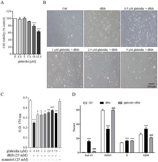 Effect of glabridin treatment on oxidative stress-induced cell cycle arrest. MC3T3-E1 preosteoblasts were treated with 2.5–12.5 µM glabridin for 48 h and cell viability was determined using an MTT assay (A). MC3T3-E1 preosteoblasts were pretreated with glabridin for 3 h before exposure to oxidative stress conditions (dRib). Representative images of the MC3T3-E1 preosteoblasts (B) and cell viability (C) after treatment in HG for 48 h. The percent of cell cycle distribution was determined using flow cytometry (D). *** p < 0.001 when compared to the Ctrl group; # p < 0.05, ## p < 0.01, and ### p < 0.01 when compared to the dRib group.