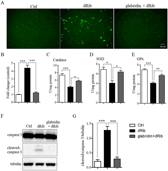 Effect of glabridin pretreatment on 2-deoxy-D-ribose-induced ROS production and apoptosis. MC3T3-E1 preosteoblasts were pretreated with glabridin for 3 h before exposure to oxidative stress conditions (dRib) for 48 h. Representative images of ROS production (A) and fluorescence intensity (B). Antioxidant enzyme activity: catalase (C), SOD (D), and GPx (E). Representative images of apoptosis protein (F) and band intensity (G). Data are shown as means ± SEM. * p < 0.05, ** p < 0.01, and *** p < 0.001 compared to the corresponding group.