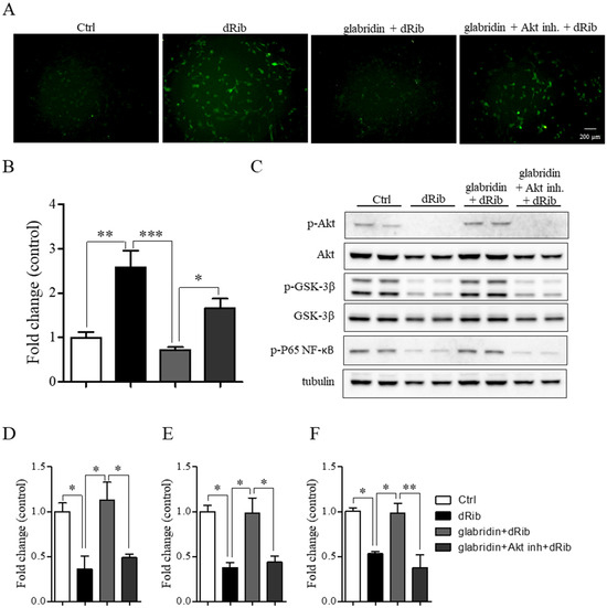 Phosphorylation of GSK-3β and P65 NF-ĸB took place downstream of phosphorylated Akt in glabridin to prevent oxidative stress-induced preosteoblast apoptosis. MC3T3-E1 preosteoblasts were pretreated with glabridin with or without the Akt inhibitor for 3 h before exposure to oxidative stress conditions (dRib) for 48 h. Representative images of ROS production were obtained using an H2DCFDA assay (A) and the fluorescence intensity was measured (B). Representative images of Western blotting (C) and quantification of band intensity for p-Akt (D), p-GSK-3β (E), and p-P65 NF-κB (F). Data are shown as means ± SEM. * p < 0.05, ** p < 0.01, and *** p < 0.001 compared to the corresponding group.