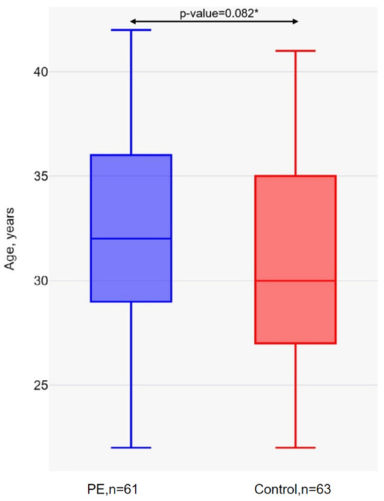 Age of pregnant women in the PE and control groups. * Mann–Whitney U-test.