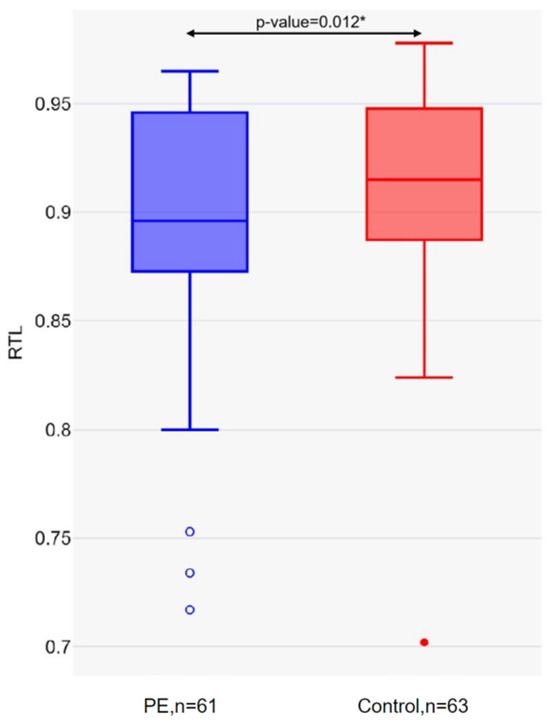 Relative leukocyte telomere length in the PE and control groups. * Mann–Whitney U-test.