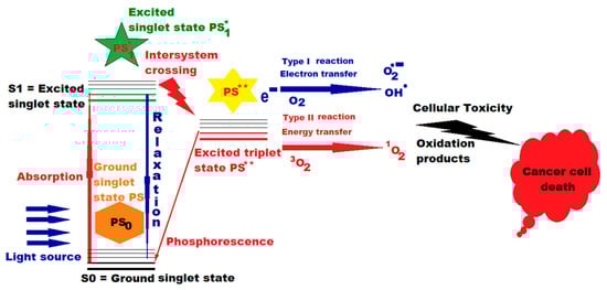 Action of PDT and photosensitizer (PS) in cancer therapy. A single asterisk * means “excited singlet state”, and two asterisks ** mean “excited triplet state” (Figure 1 was imagined and drawn by L.M.A. using Microsoft Paint 3D for Windows 10, being already published by L.M.A. [21]).