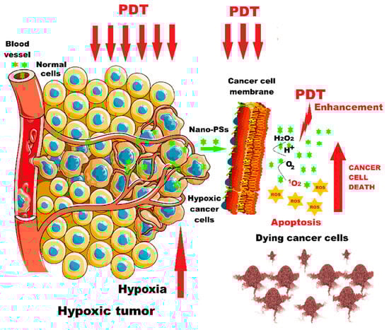 PDT enhancement in hypoxic tumors using nano-photosensitizers. Nano-PSs = nano-photosensitizers (Figure 4 was imagined and drawn by L.M.A. using Microsoft Paint 3D for Windows 10 and using completely free picture material from SeekPNG.com (accessed on 9 March 2025), for which we are very grateful).