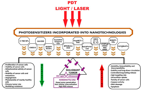 The primary aim of this review was to present a synthesis of current photosensitizers and the nanotechnologies in which they can be incorporated as PDT nanoagents, multifunctional theranostic nanoplatforms, and nanoshuttles successfully applied in preclinical studies of photodynamic therapy, with a focus on solid tumors.