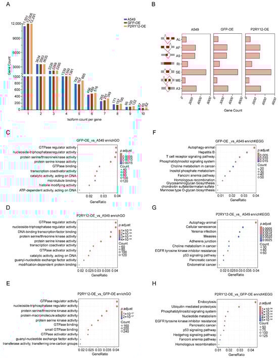 Liu, Q.; Liu, Z.; Qian, Y.; Wu, M.; Mo, J.; Wang, C.; Xu, G.; Leng, L.; Zhang, S. Alterations in Gene Expression and Alternative Splicing Induced by Plasmid-Mediated Overexpression of GFP and P2RY12 Within the A549 Cell Line. Int. J. Mol. Sci. 2025, 26, 2973. https://doi.org/10.3390/ijms26072973