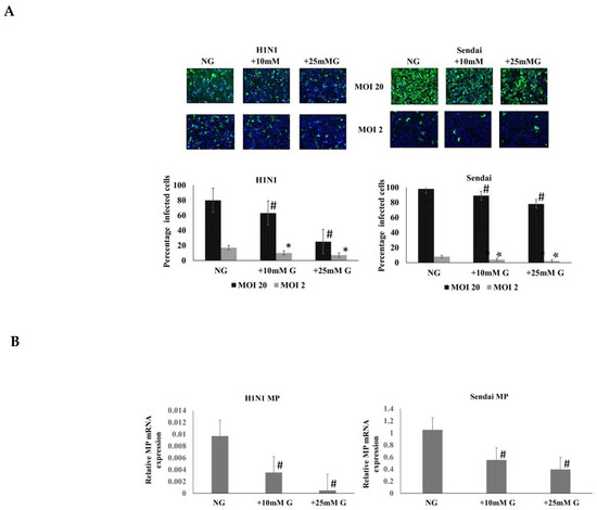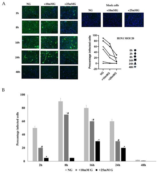 2.2. Immunofluorescence Staining of H1N1 or Sendai Virus NP in A549 Cells Control and Infected with H1N1 (MOI 20) for 2–48 h PI in NG, +10 mM G, and +25 mM G