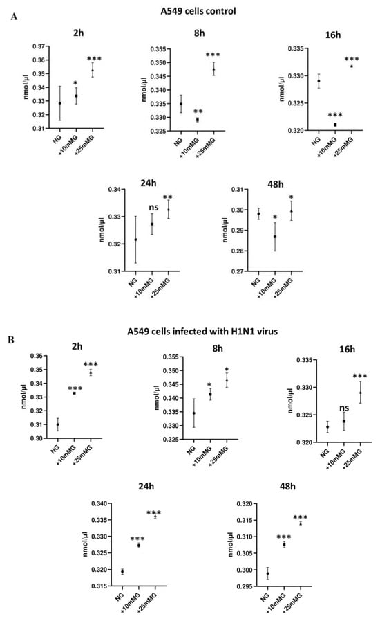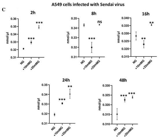 Lactate concentration (nmol/µL) in culture media of A549 cells control and infected with H1N1 or Sendai virus (MOI 10) at 2–48 h post infection (PI) in NG, +10 mM G, and +25 mM G. A549 cells were cultured in DMEM medium supplemented with 10% FCS in normal glucose (25 mM), +10 mM glucose (35 mM), and +25 mM glucose (50 mM). Cells remained uninfected (A) or they were infected with H1N1 virus (B) or Sendai virus (C) for 2, 8, 16, 24, and 48 h. Lactate concentration was measured in the supernatants of cultured cells collected at the different time points of PI, n = 4, * refers to statistical difference between the samples in the corresponding higher glucose concentrations compared to NG, *** p < 0.0005, ** p < 0.005, and * p < 0.05.