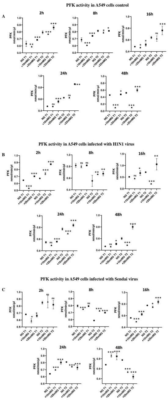 The results show that in uninfected cells (Figure 5A), the PFK activity profile in both time points of analysis (T1, 5 min and T2, 25 min) significantly decreased after culture in +10 mM G and significantly increased in +25 mM G compared to the control NG group at all time points compared to the NG control. This may indicate that +10 mM G is still biologically normal for the growth of A549 cells. The PFK activity profile changes after infecting A549 cells with either H1N1 or Sendai viruses (Figure 5B,C). Unlike in uninfected cells, when cells were infected with H1N1 virus (Figure 5B), PFK activity at the 8 h time point of PI was higher in the first time point (T1) of measurement and also significantly higher in the second time (T2) point in +10 mM G 2 and 8 h PI compared to the control NG group. Similarly, when cells were infected with Sendai virus (Figure 5C), PFK activity at the 8 h time point of PI was higher in the first time point of measurement, and significantly higher in the second time point in +10 mM G 2 and 8 h PI compared to the control NG group. A significant reduction in PFK activity in the +10 and +25 mM G groups compared to NG group was observed 24 and 48 h PI in the second time point (T2) of measurement. All observations suggest that infection or virus-related components contribute to a reduced glycolytic pattern.