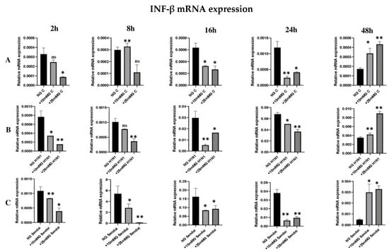 qRT-PCR expression of IFN-β mRNA in total cellular RNA of uninfected or H1N1 or Sendai virus-infected A549 cells in normal, +10 mM glucose, or +25 mM glucose concentration. 106 A549 cells were cultured in DMEM medium supplemented with 10% FCS in normal glucose (25 mM), +10 mM glucose (35 mM), and +25 mM glucose (50 mM). Cells remained uninfected (A) or they were infected with H1N1 virus (B) or Sendai virus (C) for 2, 8, 16, 24, and 48 h. Cells were collected at different times after infection, and total cellular RNA was isolated. cDNA was subjected to qRT-PCR to detect the relative expression of IFNβ (β actin mRNA level was used as a reference), n = 3, * refers to statistical difference between the samples in the corresponding higher glucose concentrations compared to NG, * p < 0.05, and ** p < 0.005. All tests were carried out in duplicate or triplicate.